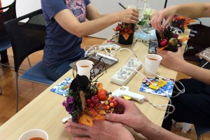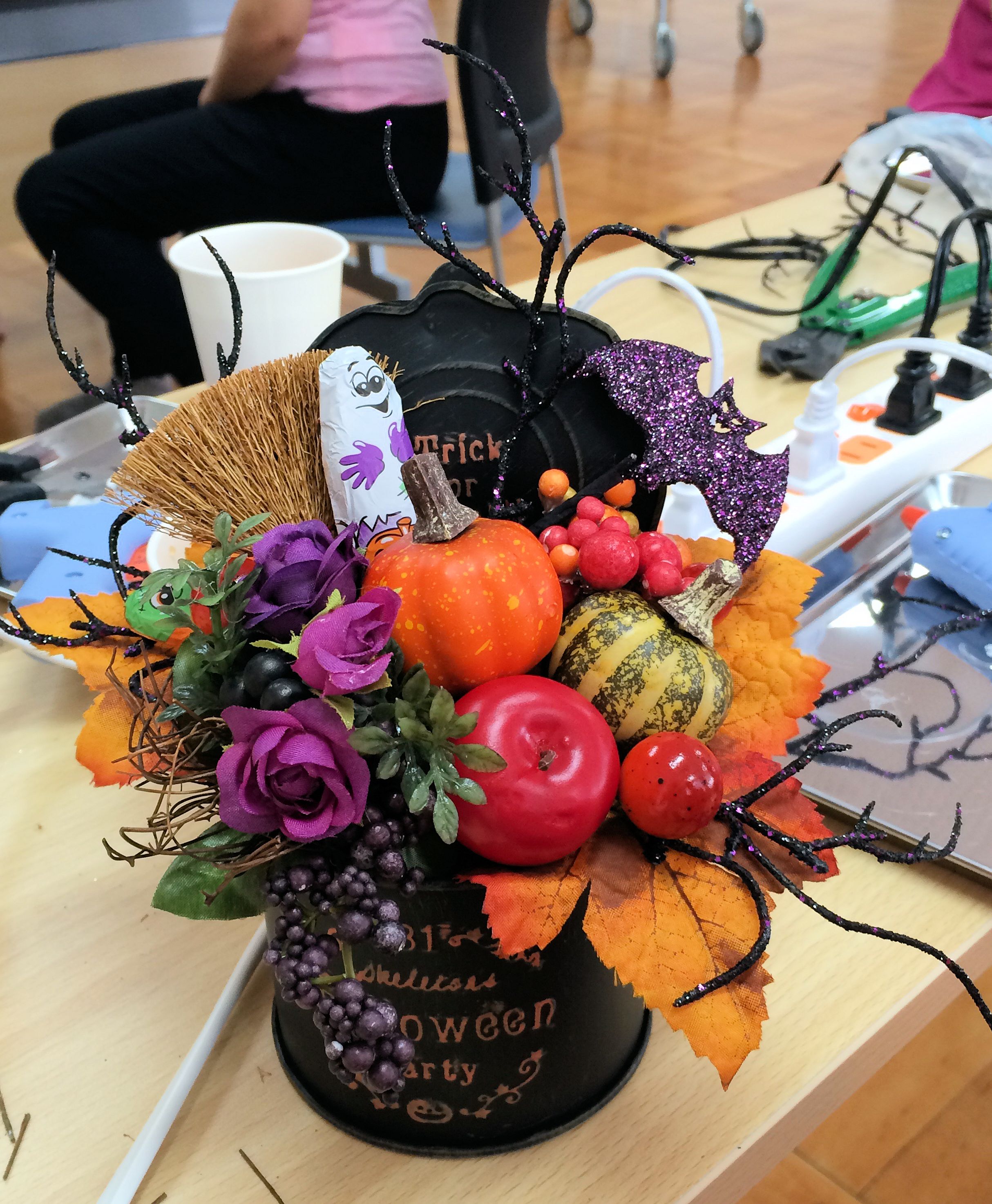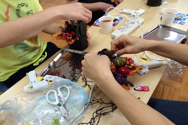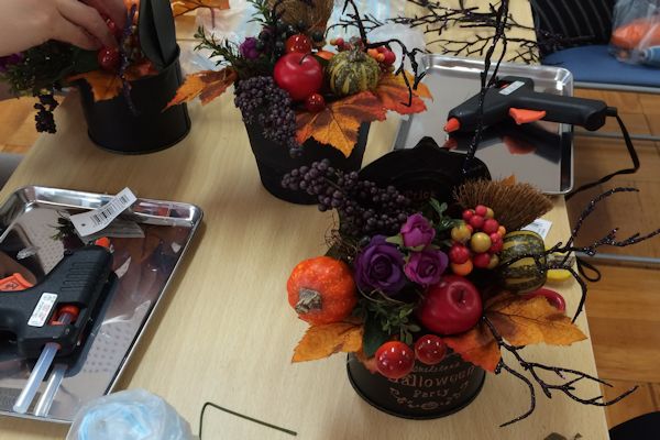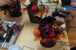 いつもの朝ヨガの後に、ハロウィンのフラワーアレンジを制作するという