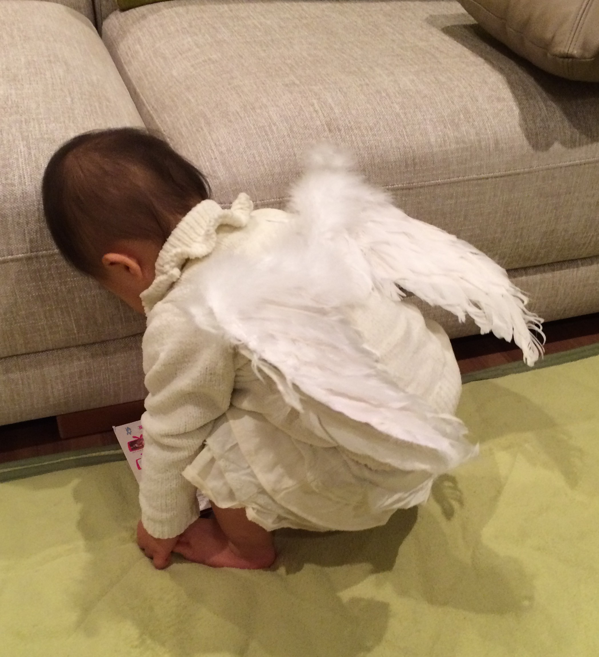 「女神を意識した格好で!」というドレスコード?があり、どうしたもんか頭を悩ませた末、1歳になる娘に天使の羽を付けて参加してみました。