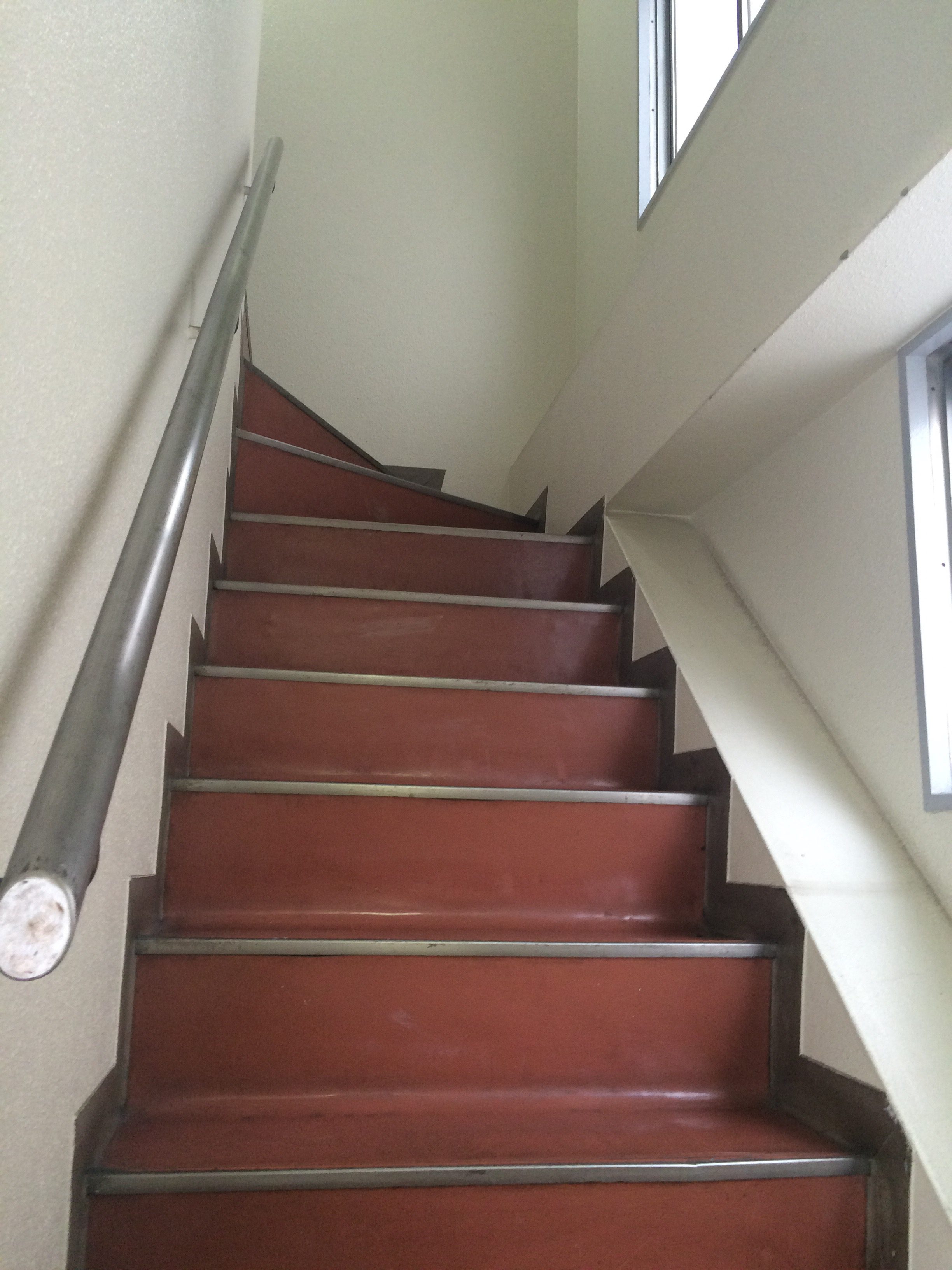 ビルの入り口を入ると、「うわっ!すごい階段!!」。まずは、ウォーミングアップ開始です。