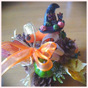 たくさんの松ぼっくりの上に、ハロウィンっぽいパーツを飾って行きます。