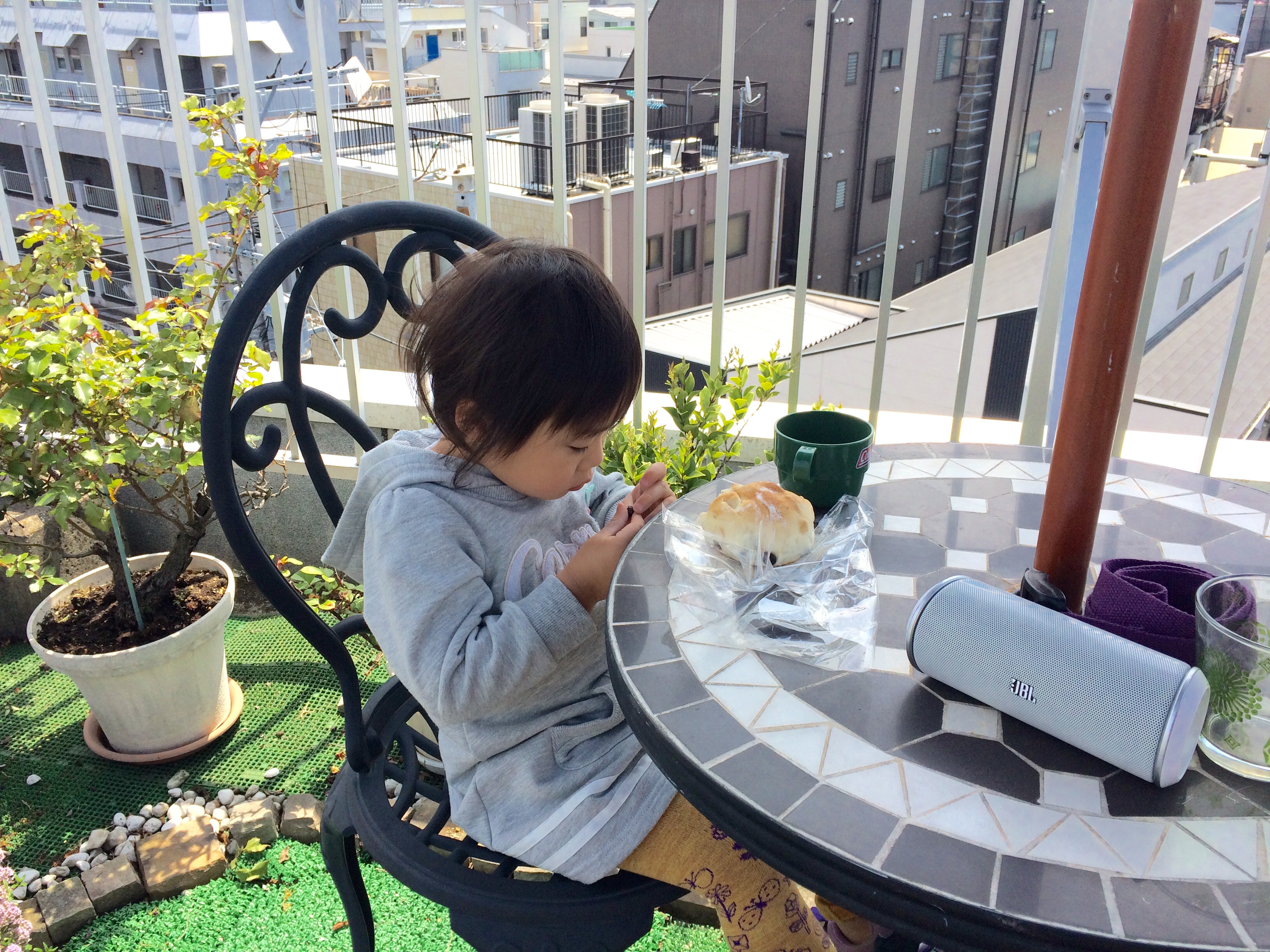 終わった後は、2歳の娘と一緒にパラソルの下でティーパーティ(彼女の流行りです。プリンセスソフィアの影響で・・・)。