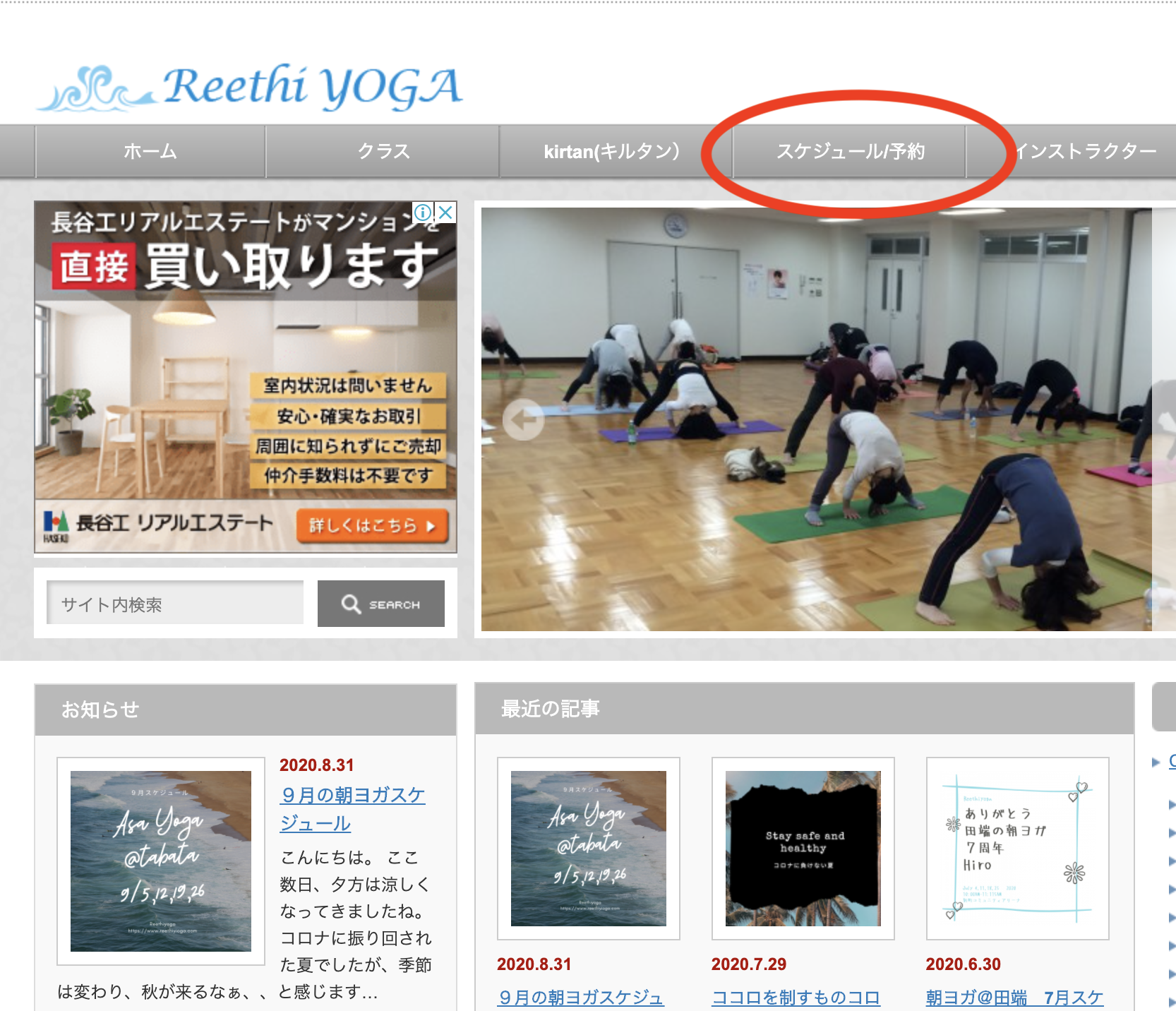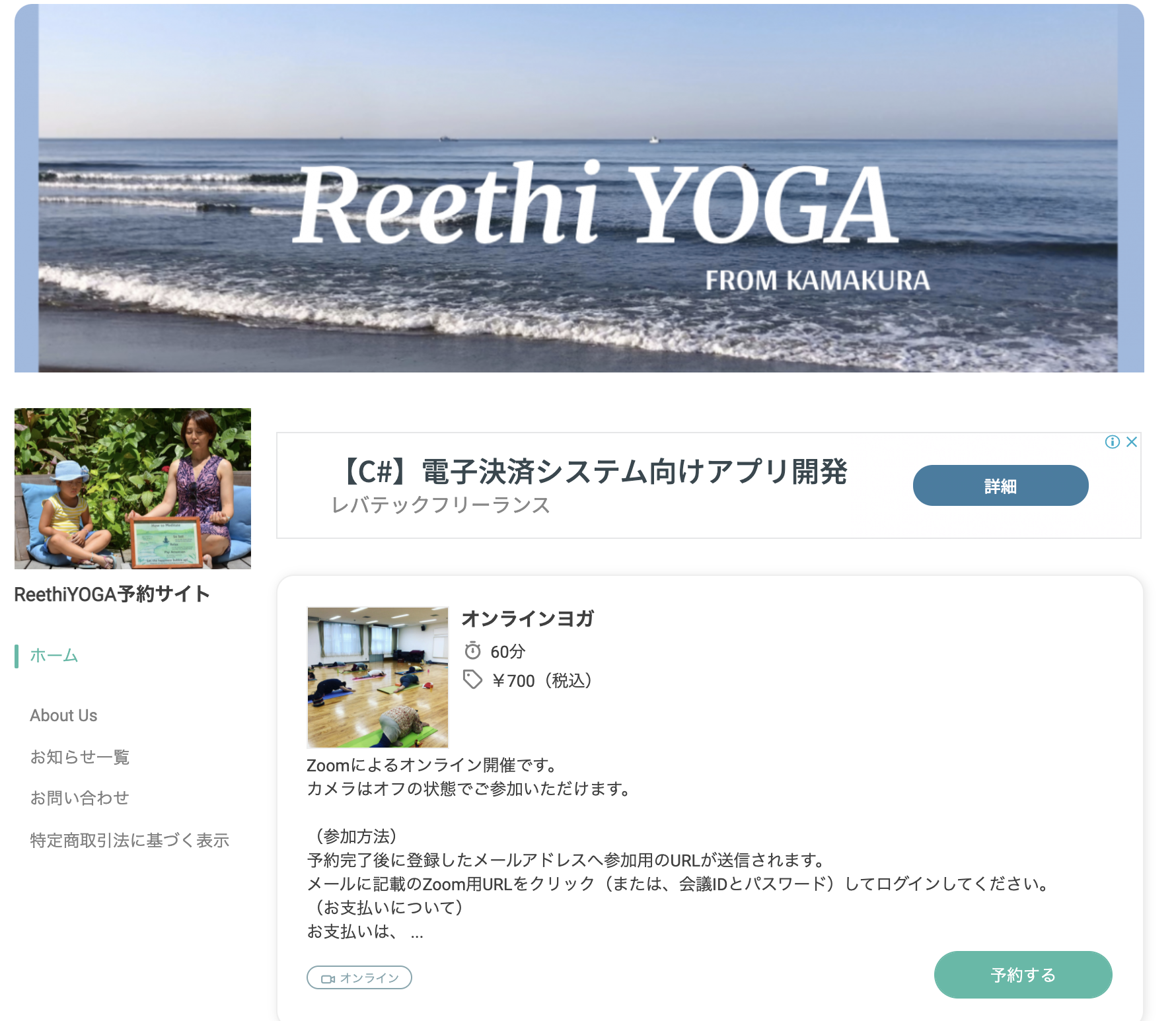 2)オンラインヨガの予約サイトに飛びます。そこから、「オンラインヨガ」のメニューから「予約する」ボタンを押下します。