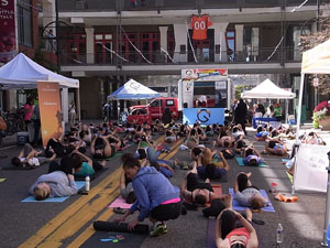 街のイベントで、人々がヨガマットを片手に集まり、道路の上でゴロン。。。。